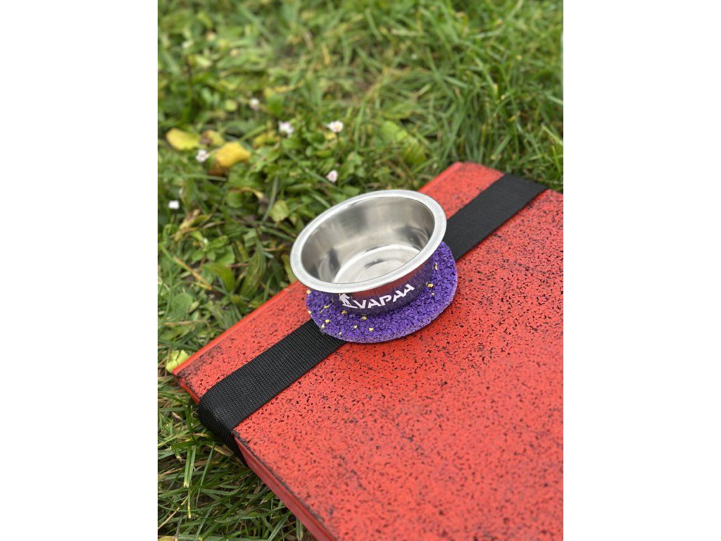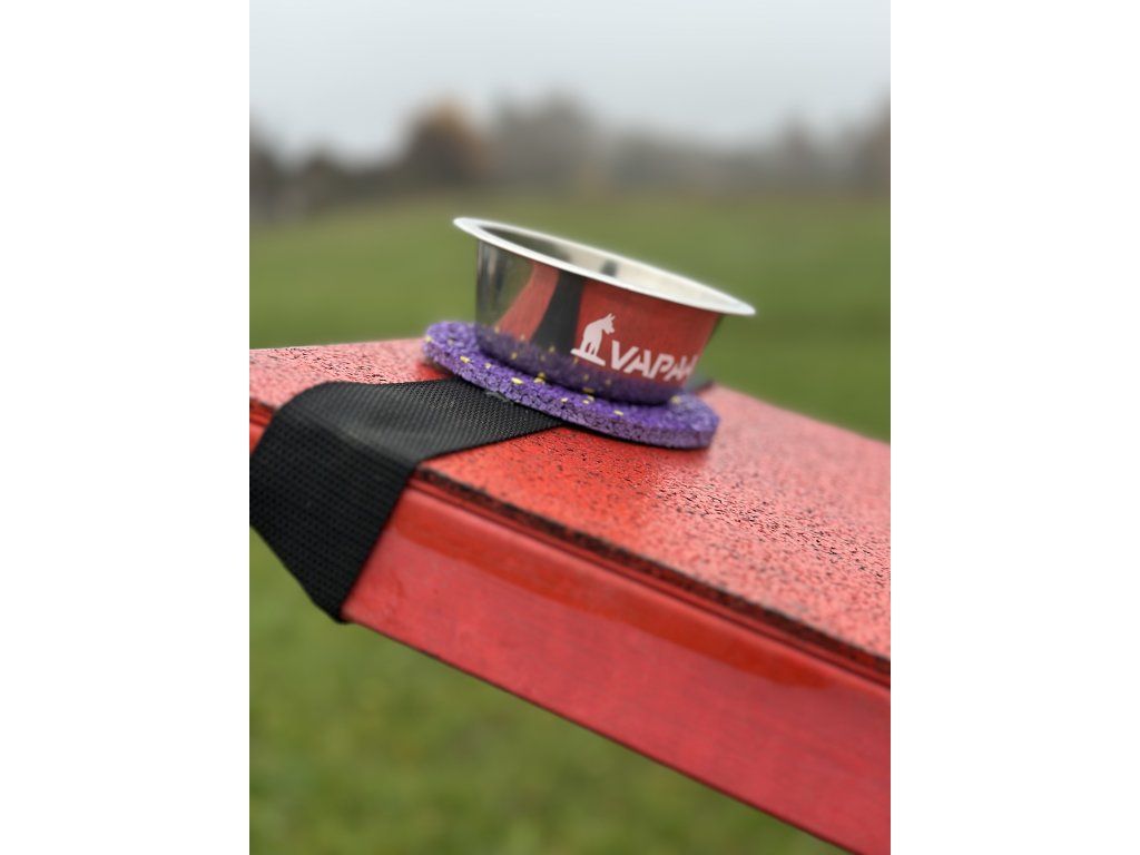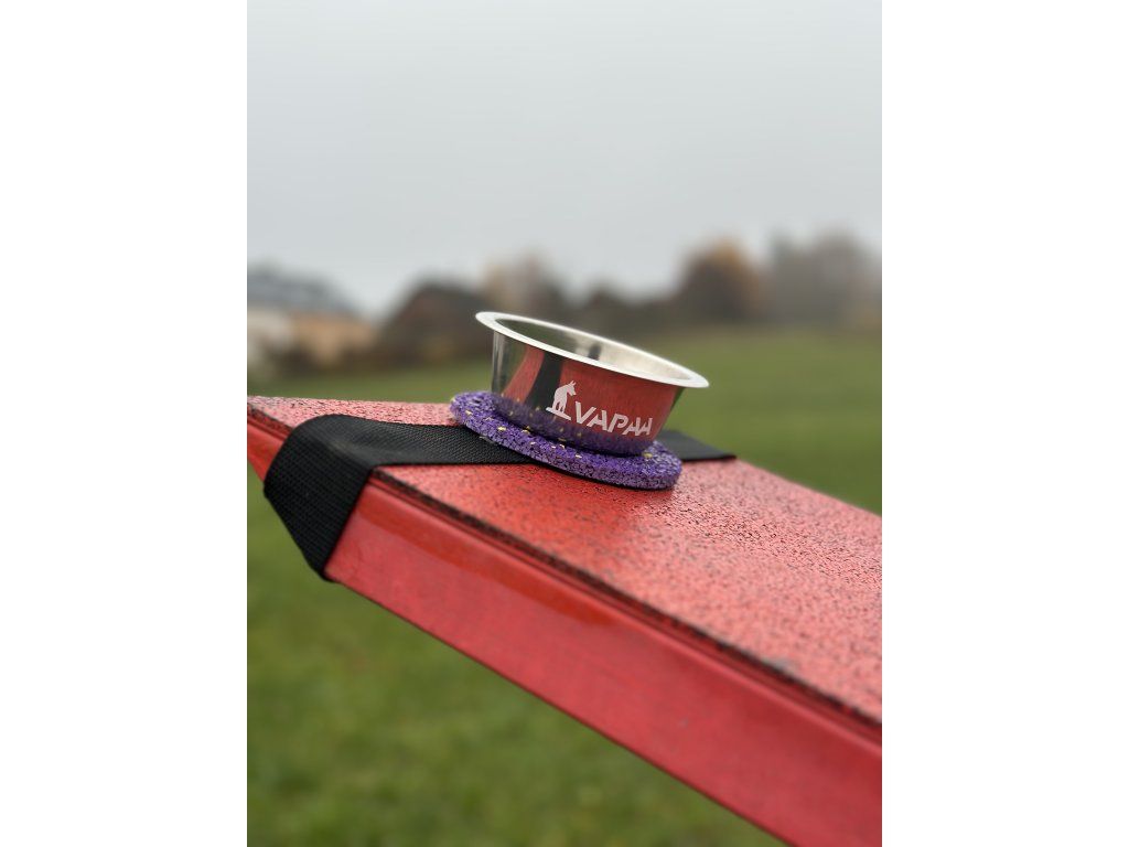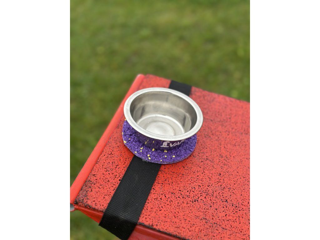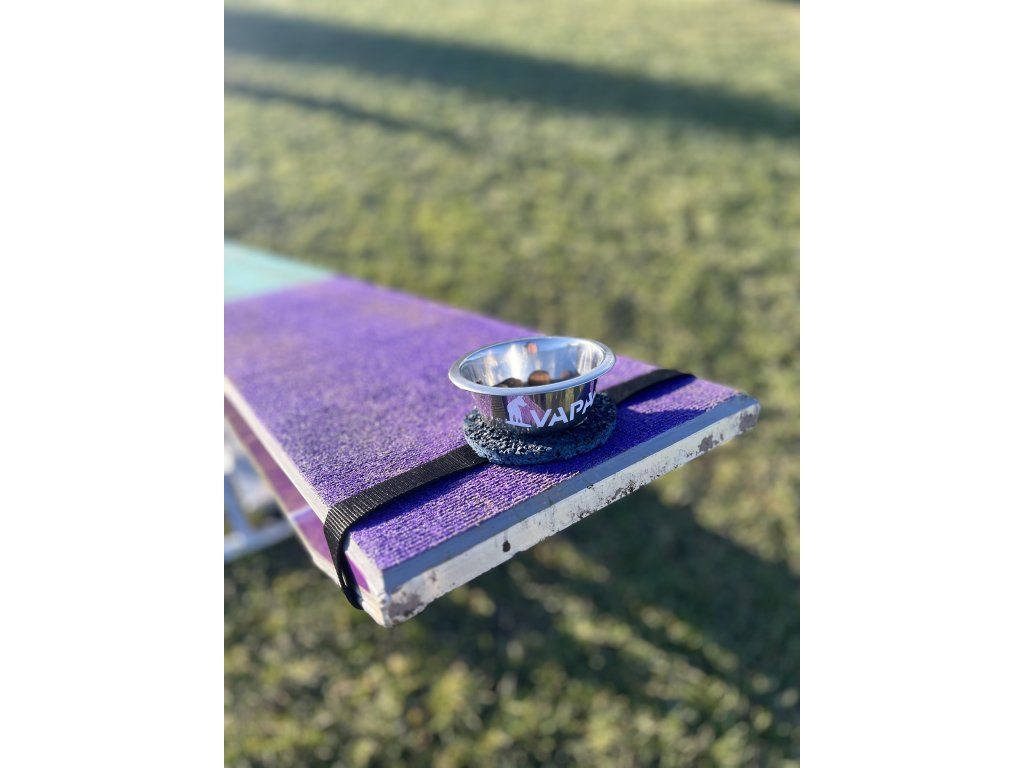 A bowl mounted on a tartan target designed for precise contact training on the seesaw. The strong elastic fastening keeps it securely in place during obstacle movement. Ideal for motivation, rewarding and building confident contact behavior.