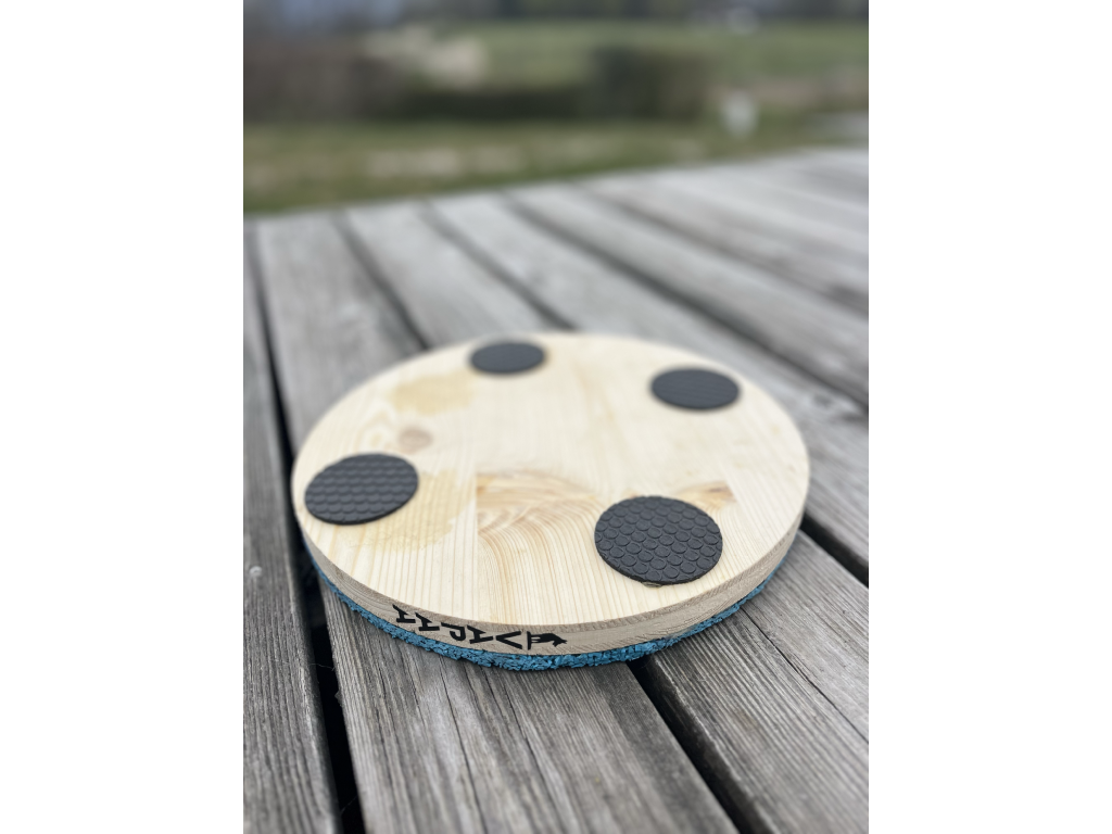 Základ tvoří pevná dřevěná deska vyfrézovaná do kruhového tvaru, která je pokrytá kvalitním tartanovým povrchem. Ten poskytuje ideální přilnavost pro tlapky a podporuje aktivní zapojení psa během tréninku. Spodní strana je opatřena protiskluzovou vrstvou, díky které fitboard pevně drží na místě.